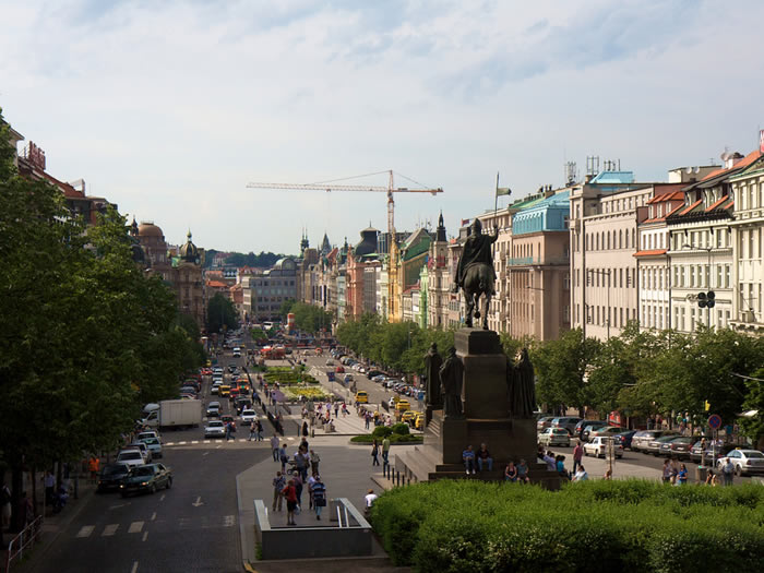 Esta gran plaza está dominada en su parte alta por el gran edificio neo-renacentista del Museo Nacional (Narodní Muzeum) y la estatua ecuestre de San Wenceslao rodeada por los cuatro patronos de Bohemia.